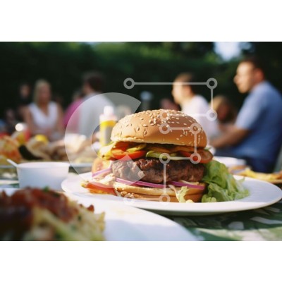 Υπάρχει δυνατότητα προσωποποίησης με δική σας φωτογραφία και προσαρμογής διαστάσεων κατόπιν παραγγελίας. Το συγεκεριμενο puzzle παρουσιαζει Η εικόνα παρουσιάζει ένα μεγάλο μπέργκερ σε ένα λευκό πιάτο στη μέση ενός τραπεζιού, που περιβάλλεται από πολλά άτομα. Κάποιοι απολαμβάνουν το γεύμα ενώ άλλοι παρατηρούν με ενδιαφέρον. Μπολ και πιάτα είναι διάσπαρτα τριγύρω, υποδεικνύοντας μια εκδήλωση για φαγητό σε εξωτερικού