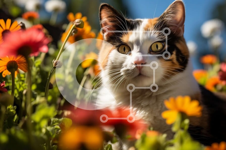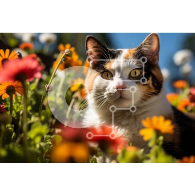 Υπάρχει δυνατότητα προσωποποίησης με δική σας φωτογραφία και προσαρμογής διαστάσεων κατόπιν παραγγελίας. Το συγεκεριμενο Puzzle 10x10 cm – 25 κομμ παρουσιαζει Αυτή η εικόνα παρουσιάζει μια γάτα calico που κάθεται σε ένα χωράφι με ζωντανά λουλούδια. Η γούνα της γάτας είναι ένα όμορφο μείγμα μαύρου, καφέ και λευκού και έχει λαμπερά πράσινα μάτια. Το φόντο είναι γεμάτο με κόκκινες, πορτοκαλί και κίτρ