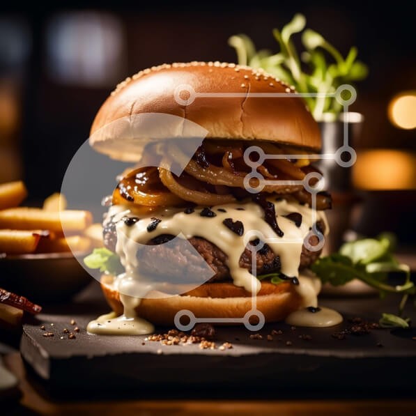 Υπάρχει δυνατότητα προσωποποίησης με δική σας φωτογραφία και προσαρμογής διαστάσεων κατόπιν παραγγελίας. Το συγεκεριμενο puzzle παρουσιαζει Αυτή η εικόνα παρουσιάζει ένα λαχταριστό χάμπουργκερ με τυρί, κρεμμύδια και σάλτσα, σερβιρισμένο σε ένα μαλακό ψωμάκι. Συνοδεύεται από μια πλευρά από τραγανές τηγανητές πατάτες. Το μπιφτέκι είναι τέλεια μαγειρεμένο και οι επικαλύψεις στοιβάζονται στην τελειότητα. Είναι ένα νόσ