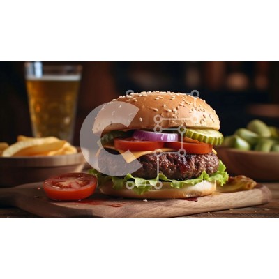 Υπάρχει δυνατότητα προσωποποίησης με δική σας φωτογραφία και προσαρμογής διαστάσεων κατόπιν παραγγελίας. Το συγεκεριμενο puzzle παρουσιαζει Αυτή η εικόνα παρουσιάζει ένα νόστιμο cheeseburger με μαρούλι, ντομάτα και τουρσιά, σερβιρισμένο σε μια ρουστίκ ξύλινη σανίδα. Στο βάθος, υπάρχει ένα ποτήρι παγωμένη μπύρα, προσθέτοντας στη συνολική απόλαυση του γεύματος. Το μπιφτέκι φαίνεται ζουμερό και τα λαχανικά είναι φρέσ