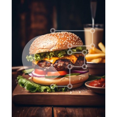 Υπάρχει δυνατότητα προσωποποίησης με δική σας φωτογραφία και προσαρμογής διαστάσεων κατόπιν παραγγελίας. Το συγεκεριμενο puzzle παρουσιαζει Αυτή η εικόνα είναι ενός cheeseburger με μαρούλι, ντομάτα και τηγανιτές πατάτες. Το μπιφτέκι είναι τέλεια μαγειρεμένο και ολοκληρώνεται με φρέσκα υλικά. Οι πατάτες είναι τραγανές και χρυσοκάστανες. Το γεύμα παρουσιάζεται σε ένα ξύλινο τραπέζι, το οποίο προσθέτει στη ρουστίκ αί