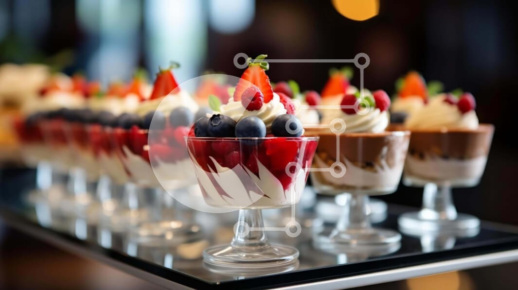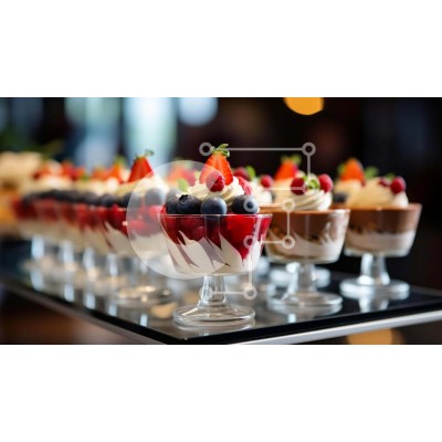 Υπάρχει δυνατότητα προσωποποίησης με δική σας φωτογραφία και προσαρμογής διαστάσεων κατόπιν παραγγελίας. Το συγεκεριμενο puzzle παρουσιαζει Αυτή η εικόνα παρουσιάζει μια εμφάνιση κύπελλων επιδορπίου παρατεταγμένα σε σειρές, το καθένα με διαφορετικές γεύσεις και γαρνιτούρες. Ορισμένα είναι διακοσμημένα με φρέσκα φρούτα, ενώ άλλα περιέχουν cheesecake ή μους. Επιπλέον, στο τραπέζι είναι ορατά μικρά μπολ, τα οποία πιθ