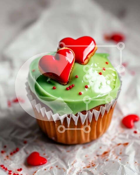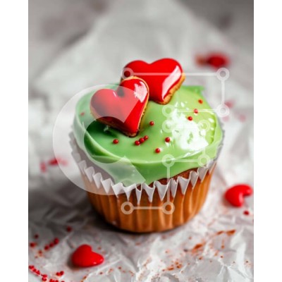 Υπάρχει δυνατότητα προσωποποίησης με δική σας φωτογραφία και προσαρμογής διαστάσεων κατόπιν παραγγελίας. Το συγεκεριμενο puzzle παρουσιαζει Αυτή η εικόνα παρουσιάζει ένα μονό cupcake διακοσμημένο με πράσινο γλάσο και κόκκινες διακοσμήσεις καρδιάς. Το cupcake τοποθετείται πάνω από χαρτοπετσέτες, υπονοώντας την προετοιμασία του για μια εκδήλωση ή πάρτι. Επιπλέον, δύο μπισκότα σε σχήμα καρδιάς τοποθετούνται κοντά στο