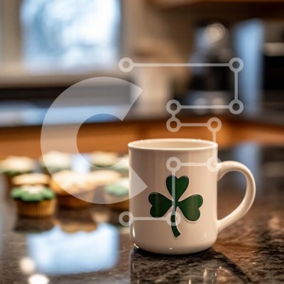 Υπάρχει δυνατότητα προσωποποίησης με δική σας φωτογραφία και προσαρμογής διαστάσεων κατόπιν παραγγελίας. Το συγεκεριμενο puzzle παρουσιαζει Η εικόνα παρουσιάζει μια λευκή κούπα διακοσμημένη με σχέδιο πράσινου τριφύλλου, τοποθετημένη σε έναν πάγκο από σκούρο γρανίτη. Στο βάθος διακρίνεται μια επιλογή από cupcakes με πράσινο frosting, υποδηλώνοντας μια εορταστική ατμόσφαιρα. Ο απαλός φωτισμός από το παράθυρο αναδεικ
