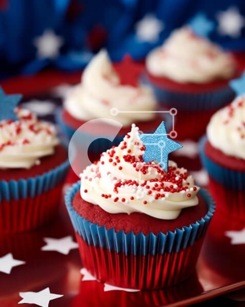 Υπάρχει δυνατότητα προσωποποίησης με δική σας φωτογραφία και προσαρμογής διαστάσεων κατόπιν παραγγελίας. Το συγεκεριμενο puzzle παρουσιαζει Η εικόνα δείχνει έναν δίσκο με cupcakes στολισμένο με κόκκινο, λευκό και μπλε γλάσο. Κάθε cupcake εμφανίζεται πάνω από ένα άλλο cupcake, δημιουργώντας μια οπτικά ελκυστική διάταξη. Επιπλέον, πολλά αστέρια είναι σκορπισμένα στην επιφάνεια εργασίας, προσθέτοντας μια εορταστική π