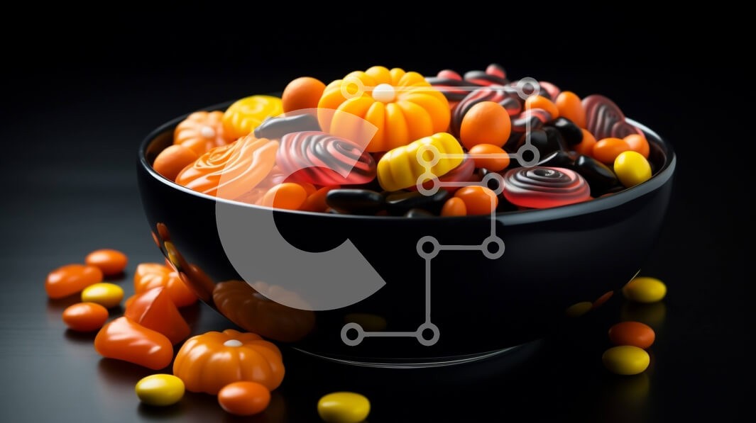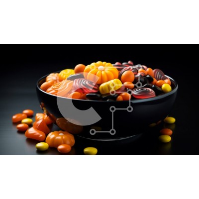 Υπάρχει δυνατότητα προσωποποίησης με δική σας φωτογραφία και προσαρμογής διαστάσεων κατόπιν παραγγελίας. Το συγεκεριμενο puzzle παρουσιαζει Αυτή η εικόνα παρουσιάζει ένα μαύρο μπολ γεμάτο με μια ποικιλία από καραμέλες, συμπεριλαμβανομένων των πορτοκαλί, κίτρινων και μαύρων κολλωδών αρκούδων, καθώς και πορτοκαλί και μαύρα σκουλήκια. Η καραμέλα είναι διατεταγμένη με παιχνιδιάρικο και τυχαίο τρόπο, με μερικά κομμάτια