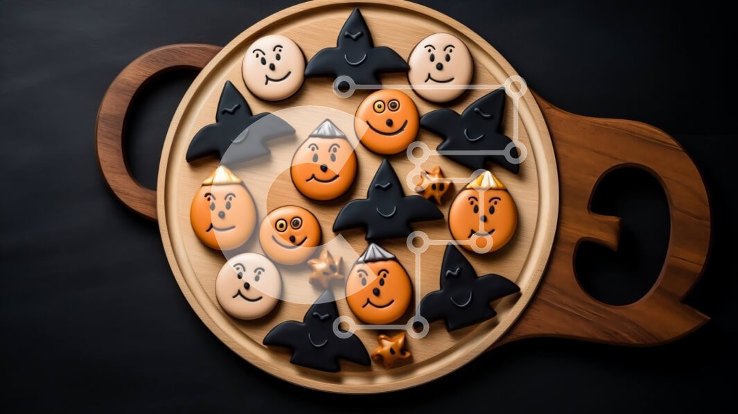 Υπάρχει δυνατότητα προσωποποίησης με δική σας φωτογραφία και προσαρμογής διαστάσεων κατόπιν παραγγελίας. Το συγεκεριμενο puzzle παρουσιαζει Αυτή η εικόνα δείχνει έναν δίσκο με μπισκότα με θέμα το Halloween. Τα μπισκότα είναι περίπλοκα διακοσμημένα με πρόσωπα κολοκύθας, νυχτερίδες και άλλους τρομακτικούς χαρακτήρες. Τοποθετούνται σε ξύλινη πιατέλα, η οποία μπορεί να χρησιμοποιηθεί για την προβολή ή το σερβίρισμα τω