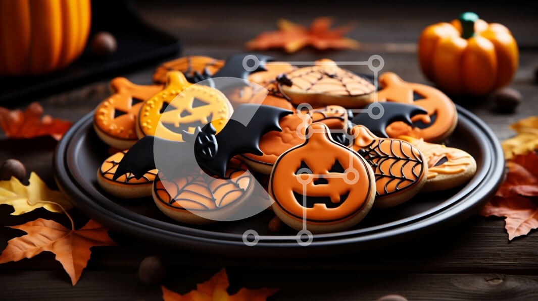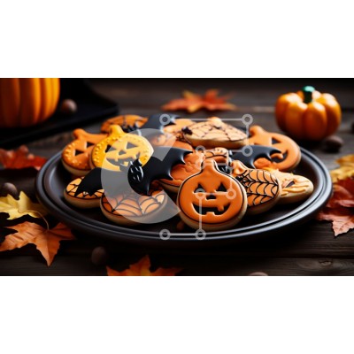 Υπάρχει δυνατότητα προσωποποίησης με δική σας φωτογραφία και προσαρμογής διαστάσεων κατόπιν παραγγελίας. Το συγεκεριμενο puzzle παρουσιαζει Αυτή η εικόνα παρουσιάζει ένα πιάτο με μπισκότα ζάχαρης με θέμα το Halloween. Τα μπισκότα έχουν σχήμα κολοκύθας, νυχτερίδας και φαναριών και είναι διακοσμημένα με μαύρο και πορτοκαλί γλάσο. Το πιάτο τοποθετείται σε ένα σκούρο ξύλινο τραπέζι με διάσπαρτα φύλλα πτώσης γύρω του.