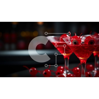 Υπάρχει δυνατότητα προσωποποίησης με δική σας φωτογραφία και προσαρμογής διαστάσεων κατόπιν παραγγελίας. Το συγεκεριμενο puzzle παρουσιαζει Αυτή η εικόνα παρουσιάζει τρία κόκκινα ποτήρια μαρτίνι γεμάτα με κεράσια και βολβούς ματιών. Τα ποτήρια τοποθετούνται σε ένα διακοσμημένο τραπέζι με διάφορα αντικείμενα όπως κεριά, λουλούδια και άλλα διακοσμητικά. Επιπλέον, υπάρχουν πολλά κομμάτια φρούτων διάσπαρτα γύρω από το