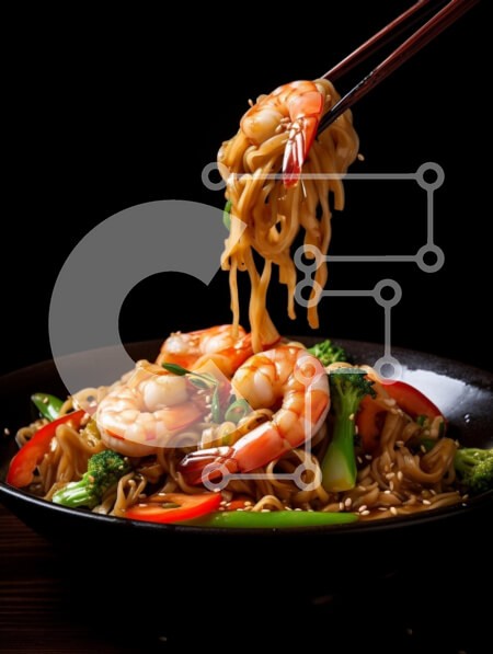 Υπάρχει δυνατότητα προσωποποίησης με δική σας φωτογραφία και προσαρμογής διαστάσεων κατόπιν παραγγελίας. Το συγεκεριμενο puzzle παρουσιαζει Η εικόνα παρουσιάζει μια νόστιμη μερίδα νουντλς γαρίδας σε μαύρο μπολ. Τα νουντλς ανυψώνονται με ξυλάκια, αναδεικνύοντας τα ζωηρά χρώματα των γαρίδων, του μπρόκολου και της κόκκινης πιπεριάς που αναμειγνύονται ανάμεσα στα ζυμαρικά. Το σκούρο φόντο τονίζει την ελκυστικότητα του
