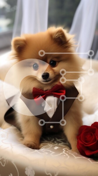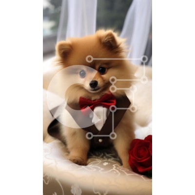 Υπάρχει δυνατότητα προσωποποίησης με δική σας φωτογραφία και προσαρμογής διαστάσεων κατόπιν παραγγελίας. Το συγεκεριμενο Puzzle 10x10 cm – 25 κομμ παρουσιαζει Αυτή η εικόνα παρουσιάζει έναν σκύλο Pomeranian ντυμένο με σμόκιν με κόκκινο παπιγιόν, να κάθεται με χάρη σε μια απαλή επιφάνεια στολισμένη με κομψά σχέδια. Ο σκύλος έχει χνουδωτό τρίχωμα, μεγάλα εκφραστικά μάτια και φαίνεται να είναι σε μια