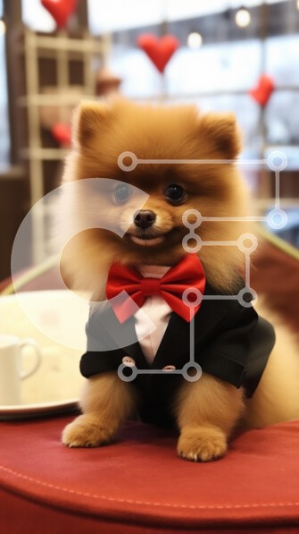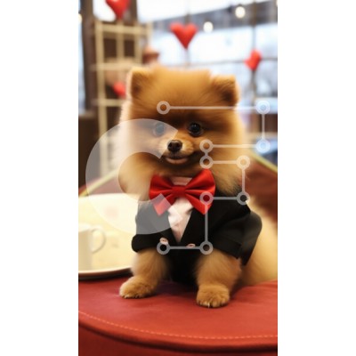 Υπάρχει δυνατότητα προσωποποίησης με δική σας φωτογραφία και προσαρμογής διαστάσεων κατόπιν παραγγελίας. Το συγεκεριμενο Puzzle 10x10 cm – 25 κομμ παρουσιαζει Η εικόνα παρουσιάζει ένα χαριτωμένο σκυλί από Πομερανία ντυμένο με επίσημο σμόκιν με κόκκινο παπιγιόν. Το χνουδωτό σκυλί κάθεται σε ένα βελούδινο κόκκινο μαξιλάρι με ένα πιάτο και ένα φλιτζάνι ορατά στο βάθος. Το σκηνικό φαίνεται να είναι έν
