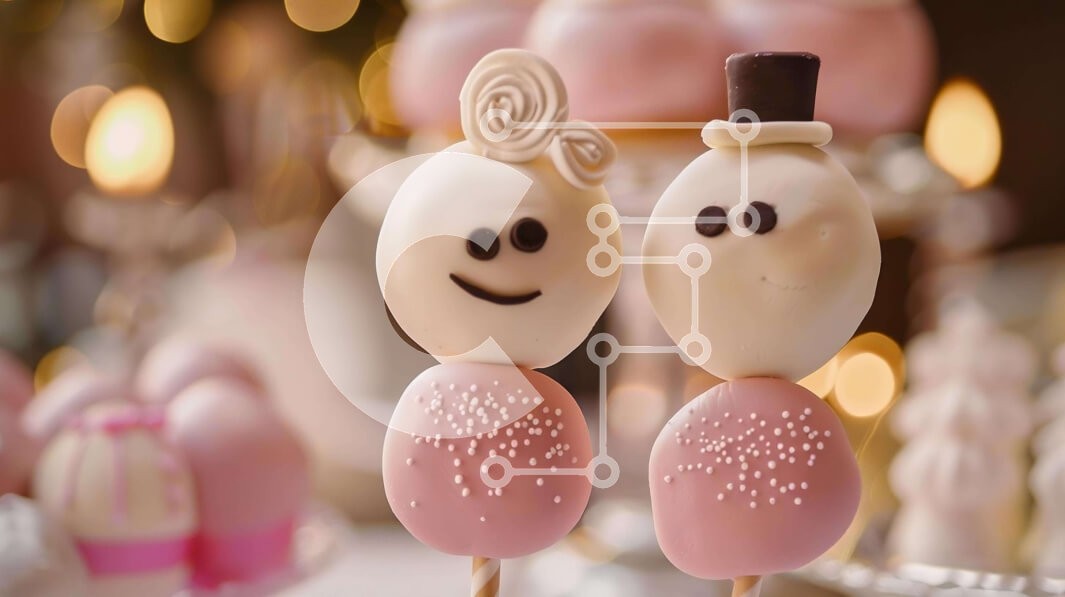 Υπάρχει δυνατότητα προσωποποίησης με δική σας φωτογραφία και προσαρμογής διαστάσεων κατόπιν παραγγελίας. Το συγεκεριμενο puzzle παρουσιαζει Αυτή η εικόνα παρουσιάζει δύο γαμήλια τούρτα πάνω σε ένα ραβδί, με τα πρόσωπα του ζευγαριού να απεικονίζονται σε λευκό και ροζ πάγωμα. Τοποθετούνται πάνω από πολλά άλλα επιδόρπια, όπως cupcakes και αρτοσκευάσματα. Το ζευγάρι είναι ντυμένο με επίσημα ρούχα, προσθέτοντας μια νότ