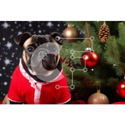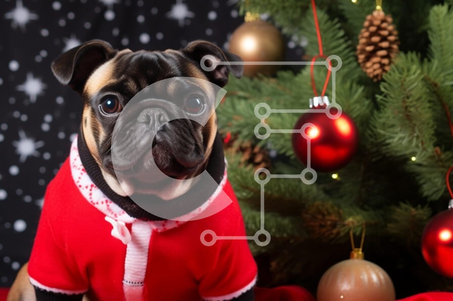 Υπάρχει δυνατότητα προσωποποίησης με δική σας φωτογραφία και προσαρμογής διαστάσεων κατόπιν παραγγελίας. Το συγεκεριμενο Puzzle 10x10 cm – 25 κομμ παρουσιαζει Αυτή η εικόνα παρουσιάζει ένα σκυλί πατημασιά ντυμένο με κόκκινη χριστουγεννιάτικη στολή να κάθεται δίπλα σε ένα στολισμένο χριστουγεννιάτικο δέντρο. Η πατημασιά έχει μεγάλα, εκφραστικά μάτια και περίεργη έκφραση, ενώ το σκηνικό στολίζεται μ