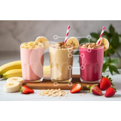 Υπάρχει δυνατότητα προσωποποίησης με δική σας φωτογραφία και προσαρμογής διαστάσεων κατόπιν παραγγελίας. Το συγεκεριμενο puzzle παρουσιαζει Αυτή η εικόνα παρουσιάζει τρία πολύχρωμα smoothies τοποθετημένα σε ψηλά ποτήρια σε μια ξύλινη σανίδα. Τα smoothies είναι διαφορετικών γεύσεων: ροζ, μπεζ και μωβ, με υλικά όπως βρώμη και φέτες μπανάνας. Οι φρέσκες φράουλες και οι φέτες μπανάνας τοποθετούνται στο προσκήνιο, προσ