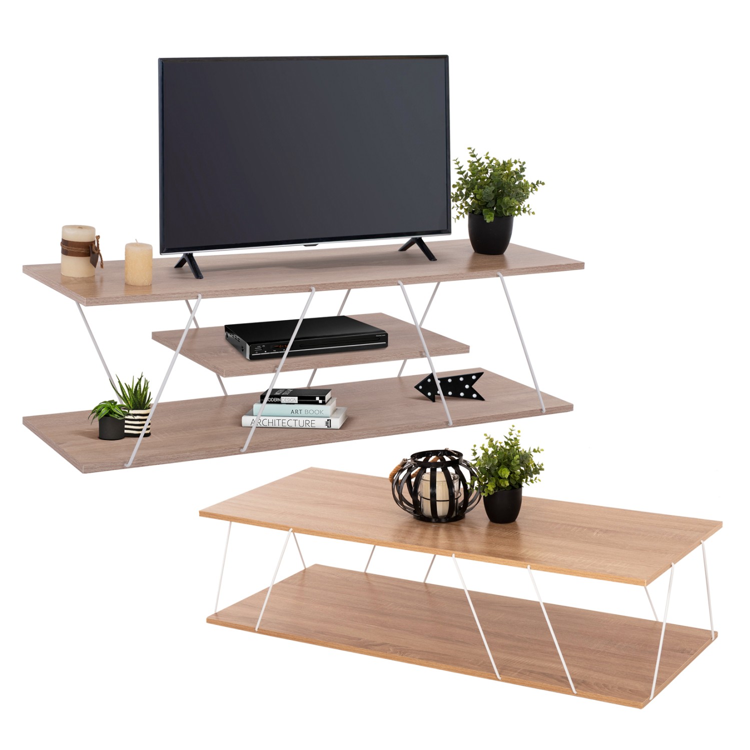 Η σύνθεση TARS θα αλλάξει την όψη στο σαλόνι σας και θα σας προσφέρει την αναβάθμιση που θέλετε. Αποτελείται από έναν συνδυασμό επίπλων για την τηλεόρασή σας με μονάδα δαπέδου και ένα τραπεζάκι σαλονιού. Όλη η σύνθεση είναι της ίδιας σειράς από μελαμίνη σε χρώμα sonama και μεταλλικές ράβδους σε ΛΕΥΚΟ χρώμα.