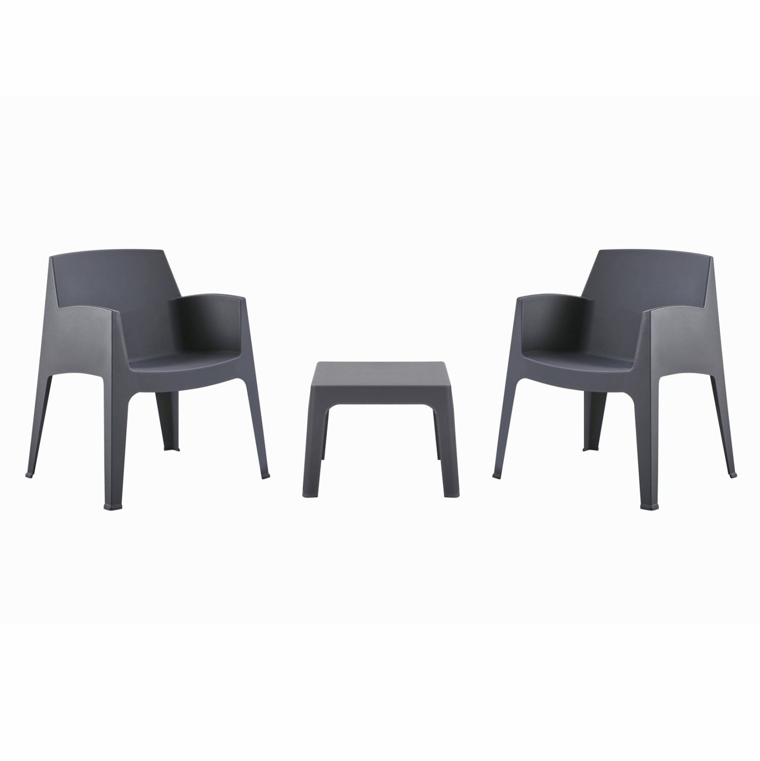 Ένα τετράγωνο τραπεζάκι και 2 στοιβαζόμενες πολυθρόνες, τα οποία είναι εξολοκλήρου κατασκευασμένα από πολυπροπυλένιο σε ΓΚΡΙ χρώμα. Σχεδιαστικά, είναι λιτό και μπορεί να χρησιμοποιηθεί με πολλούς τρόπους προσφέροντας πρακτική και ανθεκτική χρήση. Ιδανική πρόταση για χρήση σε εξωτερικούς χώρους, είτε επαγγελματικούς (χώροι δεξιώσεων, εταιρείες catering, κλπ.) είτε για το σπίτι.
