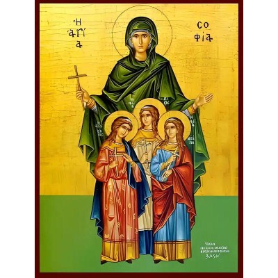 Όνομα Προϊόντος Εικόνα Ορθοδοξίας με περίγραμμα χρυσό σε ξύλο Φλαμουρίας με βάση Εικόνα ΑΓΙΕΣ ΣΟΦΙΑ ΚΑΙ ΘΥΓΑΤΕΡΕΣ, ΠΙΣΤΙΣ, ΕΛΠΙΣ ΚΑΙ ΑΓΑΠΗ, ΟΛΟΣΩΜΕΣ Χειροποίητη Ελληνορθόδοξη εικόνα του Ιησού Χριστού, Κρεμαστή πλάκα βυζαντινής τέχνης, χριστιανική τέχνη Διάσταση 40x30 c