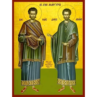 Κριτικάρετε το(τα): Εικόνα Ορθοδοξίας με περίγραμμα χρυσό σε ξύλο Φλαμουρίας με βάση Εικόνα ΑΓΙΟΙ ΑΝΑΡΓΥΡΟΙ, ΚΟΣΜΑΣ ΚΑΙ ΔΑΜΙΑΝΟΣ, ΟΛΟΣΩΜΟΙ Χειροποίητη Ελληνορθόδοξη εικόνα του Ιησού Χριστού, Κρεμαστή πλάκα βυζαντινής τέχνης, χριστιανική τέχνη Διάσταση 40x30 cm (10,2x7,9 ίν