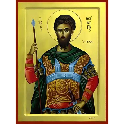Όνομα Προϊόντος Εικόνα Ορθοδοξίας με περίγραμμα χρυσό σε ξύλο Φλαμουρίας με βάση Εικόνα ΑΓΙΟΣ ΘΕΟΔΩΡΟΣ Ο ΜΕΓΑΛΟΜΑΡΤΥΣ, ΤΗΡΩΝ Χειροποίητη Ελληνορθόδοξη εικόνα του Ιησού Χριστού, Κρεμαστή πλάκα βυζαντινής τέχνης, χριστιανική τέχνη Διάσταση 40x30 cm (10,2x7,9 ίντσες) INT