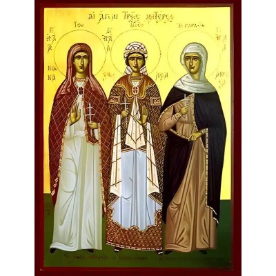 Κριτικάρετε το(τα): Εικόνα Ορθοδοξίας με περίγραμμα χρυσό σε ξύλο Φλαμουρίας με βάση Εικόνα ΑΓΙΑΙ ΤΡΕΙΣ ΜΗΤΕΡΕΣ, ΝΟΝΝΑ, ΕΜΜΕΛΕΙΑ, ΑΝΘΟΥΣΑ, ΟΛΟΣΩΜΕΣ Χειροποίητη Ελληνορθόδοξη εικόνα του Ιησού Χριστού, Κρεμαστή πλάκα βυζαντινής τέχνης, χριστιανική τέχνη Διάσταση 40x30 cm (10