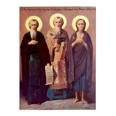 | Όνομα Προϊόντος | Εικόνα Ορθοδοξίας με περίγραμμα χρυσό σε ξύλο Φλαμουρίας με βάση Εικόνα Άγιοι Ιωάννης Κλίμακος, Γρηγόριος Παλαμάς, Μαρία Αιγυπτία Χειροποίητη Ελληνορθόδοξη , Κρεμαστή πλάκα βυζαντινής τέχνης, χριστιανική τέχνη Διάσταση 45x35 cm (17,7 x 13,8 ίντσες) INTR |