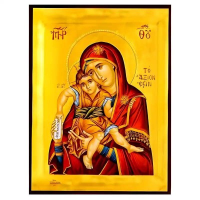 Βασικά Χαρακτηριστικά: - Σχέδιο: Κλασική βυζαντινή εικονογραφία με ζωηρό κόκκινο περίγραμμα - Υλικό: Ξύλο Μασίφ Φλαμουρία υψηλής αντοχής με προστατευτικό βερνίκι για ποιότητα που διαρκεί - Προέλευση: Χειροποίητο στην Ελλάδα - Σκοπός: Ιδανικό για γωνιές προσευχής, εκκλησίες, διακόσμηση σπιτιού ή ως δώρο με νόημα Διαθέσιμα μεγέθη: 10x7 cm (3,9 x 2,8 ίντσες) 15x11 cm (5,9 x 4,3 ίντσες) 21x15 cm (8,3 x 5,9 ίντσες) 26x20 cm (10,2 x 7,9 ίντσες) 40x30 cm (15,8 x 11,8 ίντσες) 45x35 cm (17,7 x 13,8 ίντσες) 50x40 cm (19,7 x 15,8 ίντσες)► Εικόνα της Παναγίας "Άξιον Εστί", ξύλινη. Χειροποίητη ξύλινη εικόνα, ειδικής επεξεργασίας σε σκληρό Φλαμουριά Ξύλο Εικόνα Ορθόδοξης τέχνης, σκαλισμένη ή τυπωμένη σε ξύλο φλαμουριάς υψηλής ποιότητας. Η φυσική απαλότητα και ομοιομορφία του ξύλου τονίζει κάθε λεπτομέρεια του εικονίσματος, αναδεικνύοντας τη βαθιά πνευματικότητα και την ιερότητα της παράδοσης. Ιδανική για οικιακό εικονοστάσι, δώρο βάπτισης, γάμου ή αφιέρωμα σε ναό. Το ξύλο έχει υποστεί ειδική επεξ