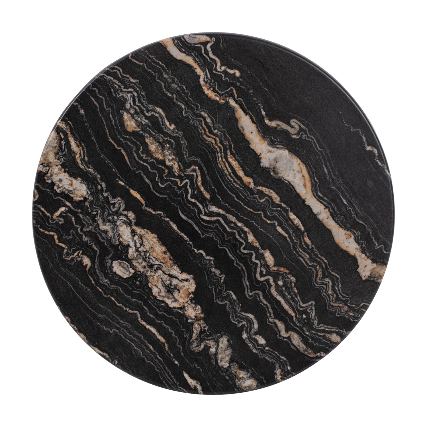 Επαγγελματική στρογγυλή επιφάνεια τραπεζιού σε χρώμα ΜΑΥΡΟ-ΧΡΥΣΟ μαρμάρου, η οποία είναι κατάλληλη για επαφή με τρόφιμα και γενικά το υλικό είναι φιλικό προς το περιβάλλον. Μπορεί να χρησιμοποιηθεί σε καφετέριες, εστιατόρια, και τουριστικά καταλύματα, είτε σε εσωτερικούς, είτε σε εξωτερικούς χώρους.