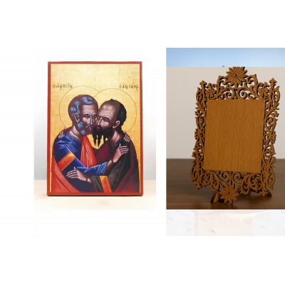 | Όνομα Προϊόντος | Εικόνα Ορθοδοξίας Δαντέλα μαζι με Βάση σε 8 χρώματα με περίγραμμα χρυσό σε ξύλο Plywood (Πλακάζ) με βάση Άγιοι Απόστολοι Παύλος και Πέτρος αγκαλιάζονται μεταξύ τους, Ξύλινη Χειροποίητη Εικόνα Ελληνικού Βυζαντινού Στυλ τοίχου που κρέμεται σε ξύλινη πλ |