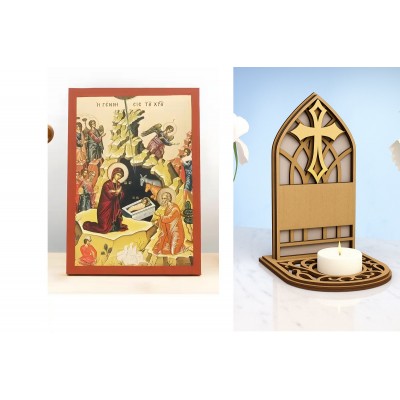| Όνομα Προϊόντος | Εικόνα Ορθοδοξίας Καντηλάκι σε 8 χρώματα με περίγραμμα χρυσό σε ξύλο Plywood (Πλακάζ) με βάση Γένεση του Ιησού Χριστού, Ξύλινη Χειροποίητη Εικόνα με χρυσό φύλλο Ελληνικού Premium Βυζαντινού Στυλ Κρεμασμένο σε ξύλινη πλάκα Θρησκευτικό Χειροποίητη Ελλην |