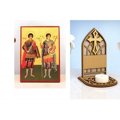 Όνομα Προϊόντος Εικόνα Ορθοδοξίας Καντηλάκι σε 8 χρώματα με περίγραμμα χρυσό σε ξύλο Plywood (Πλακάζ) με βάση Άγιοι Γεώργιος και Δημήτριος, Ξύλινη Χειροποίητη Εικόνα Ελληνικής Premium Βυζαντινού Στυλ Κρεμασμένη σε ξύλινη πλάκα Χειροποίητη Ελληνορθόδοξη εικόνα του Ιησ