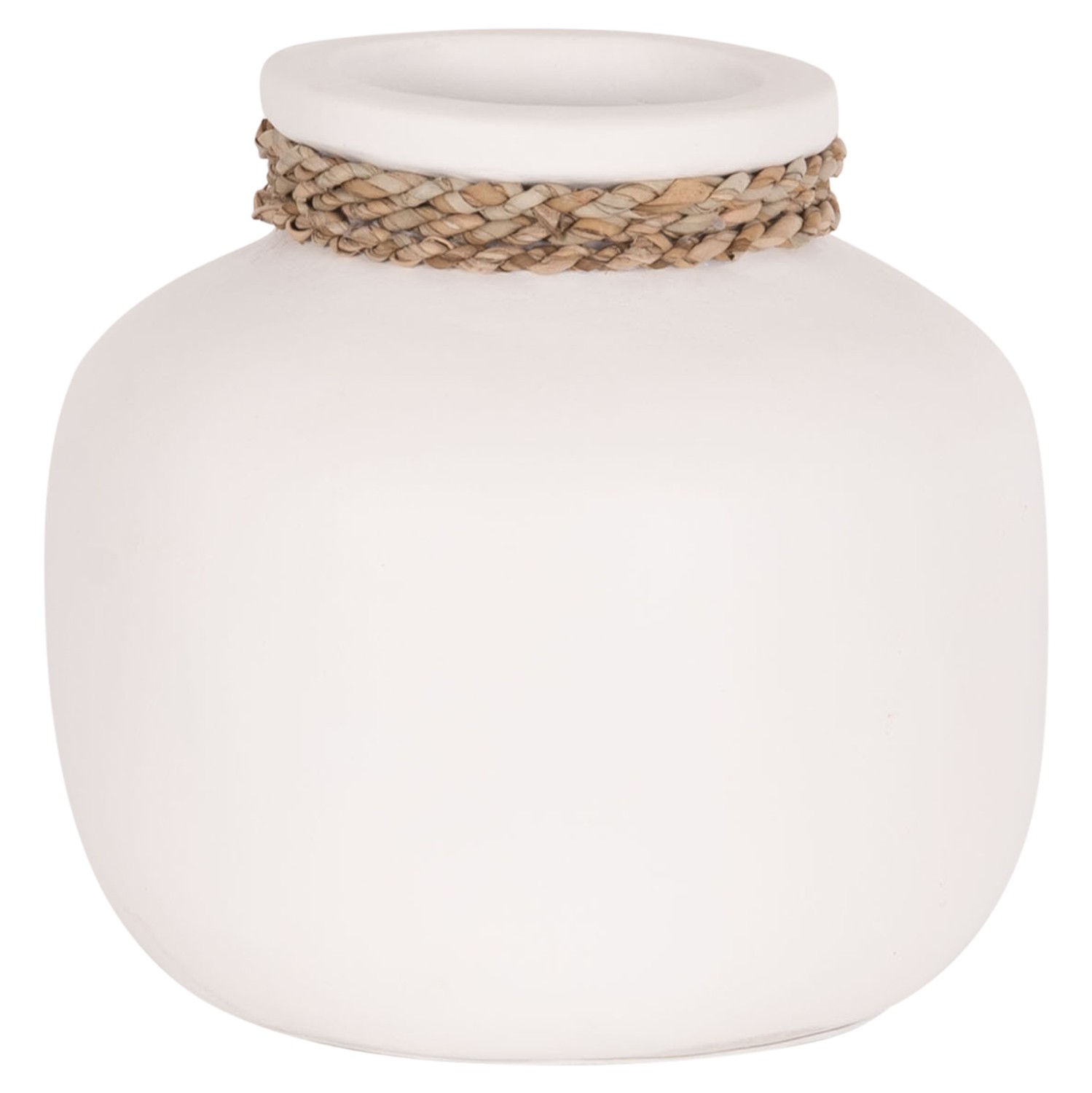 Το επιτραπέζιο χειροποίητο διακοσμητικό βάζο CAMMER είναι κατασκευασμένο εξολοκλήρου από τερακότα σε ΛΕΥΚΟ χρώμα ενώ διαθέτει διακοσμητική πλέξη από seagrass περιμετρικά στον «λαιμό» του βάζου. Ιδανικό για πληθώρα χώρων, τόσο για το σπίτι, όσο και για επαγγελματικούς χώρους.