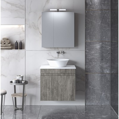 Σετ Επίπλου Μπάνιου Omega Top 60cm χρ. ΣΤΑΧΤΙ  9SOMT060BE Το Σετ Έπιπλο Μπάνιου Omega Σταχτί αποτελεί ένα στυλάτο και μοντέρνο σετ έπιπλο μπάνιο με εργονομικό σχεδιασμό αλλά και λειτουργικότητα. Ο χρωματισμός του έχει την υφή και την όψη του ξύλου σε αποχρώσεις του σταχτί. Αποτελείται από: Πάγκος κρεμαστός OMEGA Σταχτί 60  με τέλεια εφαρμογή σε όλες τις επιφάνειες με ή χωρίς πλακίδια. Περιλαμβάνει μεγάλο ερμάριο για την εξοικονόμηση επιπλέον αποθηκευτικού χώρου στο μπάνιο. Καθρέφτης OMEGA Σταχτί 60 . Περιλαμβάνει πρόσοψη καθρέφτη με δύο πόρτες. Διαθέτει εσωτερικό ράφι για να οργανώνετε καλύτερα την αποθήκευση χρηστικών αντικειμένων καθημερινής χρήσης για όλα τα μέλη της οικογένειάς σας. Corian Top  για κορυφαία ποιότητα και υψηλή αντοχή και αισθητική. Διατίθεται ατρύπητο για ευεληξια στην τοποθέτηση Νιπτήρα επικαθούμενο πορσελάνης  Διαθέτει οπή υπερχείλισης. Χαρακτηριστικά: Υλικό κατασκευής: Μελαμίνη 16mm πάχος Πρακτικοί αποθηκευτικοί χώροι Με ντουλάπι και εσωτερικό ράφι Μηχανισμοί για απαλό και αθόρυβο κλείσιμο Εύκολη τοποθέτηση Ελληνικής κατασκευής Ετοιμοπαράδοτα προϊόντα Δεν περιλαμβάνει το φωτιστικό, τη μπαταρία, τη στήλη και τα διακοσμητικά. Διατίθεται έτοιμο συναρμολογημένο.