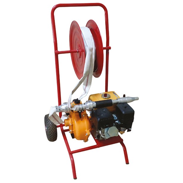 Βενζινοκίνητο αντλητικό πυρόσβεσης σε ειδική βάση με τροχούς και ανέμη για άμεση μεταφορά και χρήση, με αντλία αλουμινίου υψηλής πίεσης.
