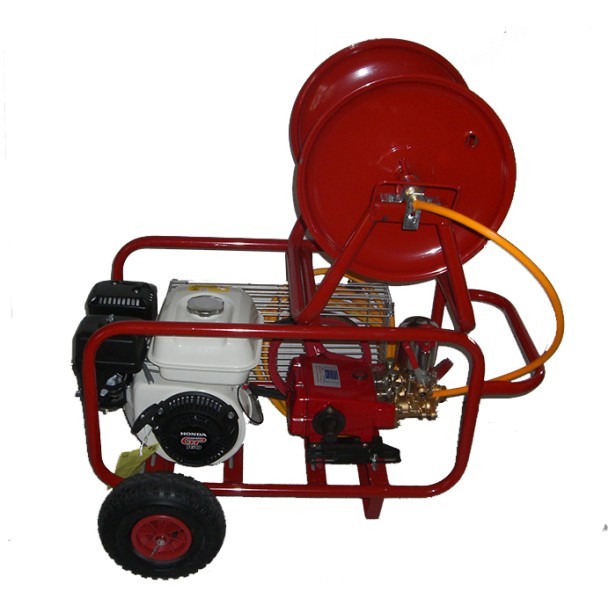 Φορητό ψεκαστικό συγκρότημα με κλειστό τροχήλατο σωληνωτό πλαίσιο, προστατευτικό κάλυμμα στους 2 ιμάντες κίνησης, 2-3 εξόδους ψεκασμού (βρυσάκια). Πανίσχυρος βενζινοκινητήρας HONDA GP200 6,5ΗΡ τετράχρονος OHV. Με σωλήνες αναρρόφησης-επιστροφής, φίλτρο αναρρόφησης, εργαλεία και manual. Συνοδεύεται και με ανέμη για το σωλήνα ψεκασμού! Ψεκαστική αντλία με πολλές δυνατότητες, κατάλληλη για ψεκασμούς εδάφους(χαμηλές καλλιέργειες) αλλά και δέντρων κλπ.