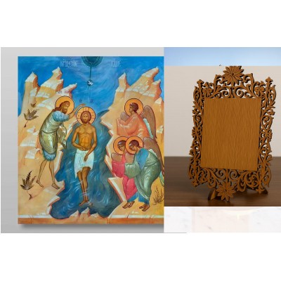 Σετ 2 τεμαχίων – Εικόνα Ορθοδοξίας Δαντέλα μαζι με Βάση σε 8 χρώματα με περίγραμμα χρυσό σε ξύλο Plywood (Πλακάζ) με βάση Η Βάπτιση του Ιησού Χριστού στον Ιορδάνη ποταμό, Χειροποίητη Ελληνορθόδοξη , Κρεμαστή πλάκα βυζαντινής τέχνης, χριστιανική τέχνη