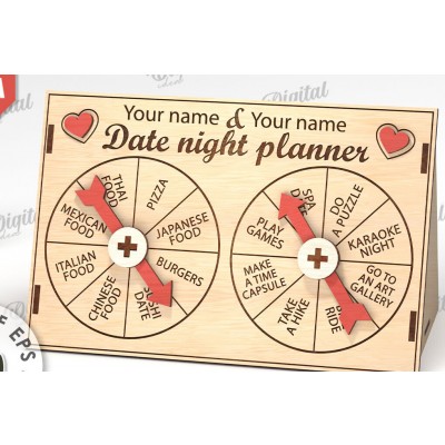 Date Night Spinner Planner Laser Cut Πρόκειται για ψηφιακό σχεδίου, ιδανικό για κοπή με ή plotter. Κατασκευασμένο απο Ξύλο από plywood [3mm ή 4mm], κομμένο με ακρίβεια στην βιοτεχνία Intrahome . Το φυσικό ξύλο προσφέρει μια κομψή, αυθεντική υφή και μπορεί εύκολα να βαφτεί ή να διακοσμηθεί σύμφωνα με το προσωπικό σας γούστο. Ελληνική παραγωγή – Κατασκευάζεται στην Ελλάδα με προσοχή στη λεπτομέρεια και υψηλές προδιαγραφές ποιότητας. ✔️ Υλικό: Plywood υψηλής ποιότητας ✔️ Διατίθεται σε πάχος 3mm ή 4mm ✔️ Ελαφρύ, ανθεκτικό και εύκολο στη χρήση ✔️ Ιδανικό για βάψιμο, χάραξη, κόλληση και χειροτεχνίες ✔️ Κατάλληλο για μπομπονιέρες, διακόσμηση, δώρα και DIY projects ✅ Εγγύηση 2 ετών – Σε περίπτωση σπασίματος, η αντικατάσταση γίνεται άμεσα, χάρη στην τοπική ελληνική παραγωγή μας. Ιδανικό για δημιουργικούς ανθρώπους που αγαπούν το DIY. Μπορεί να γίνει ξεχωριστό δώρο με προσωπικό χαρακτήρα. Φέρνει “χειροποίητη” αισθητική στη διακόσμηση. -files- Ελληνική χειροποίητη παραγωγή → στηρίζε