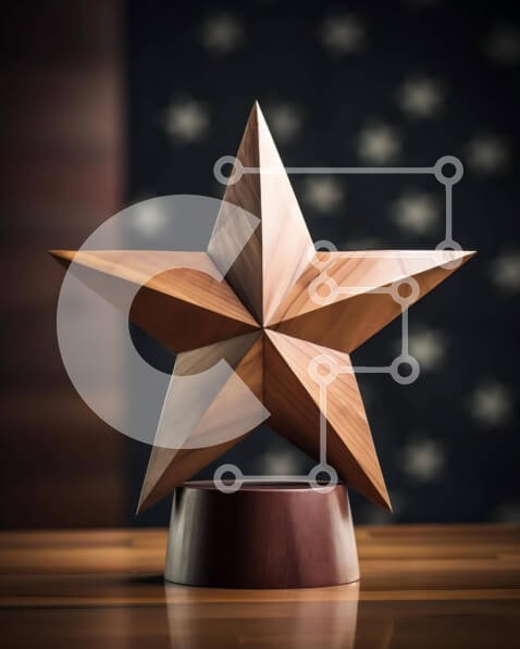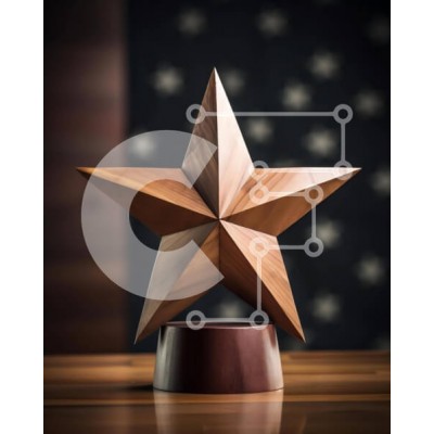 Υπάρχει δυνατότητα προσωποποίησης με δική σας φωτογραφία και προσαρμογής διαστάσεων κατόπιν παραγγελίας. Το συγεκεριμενο Puzzle 10x10 cm – 25 κομμ παρουσιαζει Η εικόνα απεικονίζει ένα ξύλινο τρόπαιο αστέρι τοποθετημένο σε ένα τραπέζι μπροστά από ένα φόντο αμερικανικής σημαίας, που περιβάλλεται από στυλό, χαρτιά και βιβλία. Υποδηλώνει ότι το τρόπαιο μπορεί να έχει απονεμηθεί για σκληρή δουλειά ή αφ