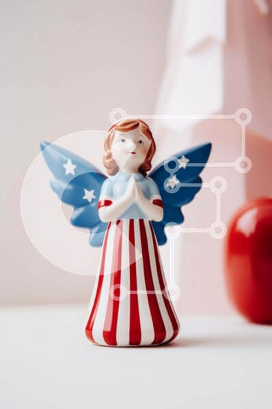 Υπάρχει δυνατότητα προσωποποίησης με δική σας φωτογραφία και προσαρμογής διαστάσεων κατόπιν παραγγελίας. Το συγεκεριμενο Puzzle 10x10 cm – 25 κομμ παρουσιαζει Η εικόνα δείχνει ένα μικρό ειδώλιο αγγέλου στολισμένο με τα χρώματα της σημαίας των Ηνωμένων Πολιτειών δίπλα σε ένα μήλο, υπονοώντας μια σύνδεση με τον εορτασμό της 4ης Ιουλίου. Το ειδώλιο είναι καλοδιατηρημένο, χωρίς σημάδια φθοράς. Ένα μο
