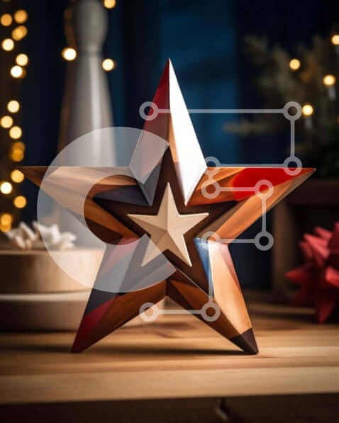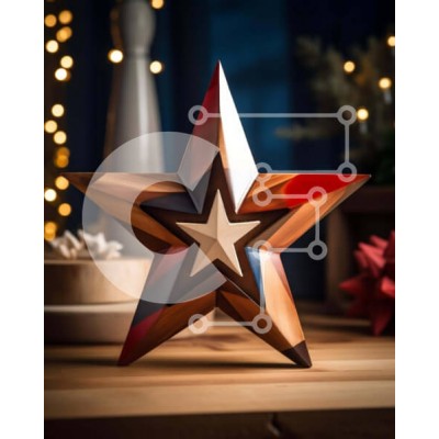 Υπάρχει δυνατότητα προσωποποίησης με δική σας φωτογραφία και προσαρμογής διαστάσεων κατόπιν παραγγελίας. Το συγεκεριμενο Puzzle 10x10 cm – 25 κομμ παρουσιαζει Η εικόνα παρουσιάζει μια διακόσμηση σε σχήμα αστεριού από ξύλο και διακοσμημένη με φώτα και στολίδια, τοποθετημένη σε ένα τραπέζι στο βάθος. Η ρύθμιση υποδηλώνει ότι χρησιμοποιείται για εορταστικές εκδηλώσεις ή ειδικές περιστάσεις. Φαίνονται