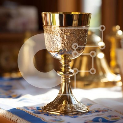 Υπάρχει δυνατότητα προσωποποίησης με δική σας φωτογραφία και προσαρμογής διαστάσεων κατόπιν παραγγελίας. Το συγεκεριμενο Puzzle 10x10 cm – 25 κομμ παρουσιαζει Αυτή η εικόνα παρουσιάζει ένα περίτεχνο χρυσό κύπελλο που κάθεται πάνω από ένα τραπέζι. Το κύπελλο είναι διακοσμημένο με περίπλοκα σχέδια και στολίδια, υποδηλώνοντας την τελετουργική του χρήση. Επιπλέον, υπάρχουν και άλλα αντικείμενα στην ει