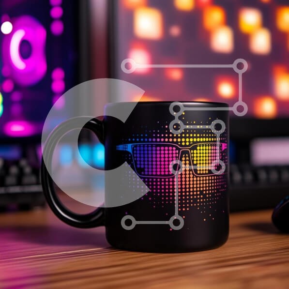 Υπάρχει δυνατότητα προσωποποίησης με δική σας φωτογραφία και προσαρμογής διαστάσεων κατόπιν παραγγελίας. Το συγεκεριμενο Puzzle 10x10 cm – 25 κομμ παρουσιαζει Αυτή η εικόνα παρουσιάζει μια μαύρη κούπα καφέ με ένα πολύχρωμο σχέδιο γυαλιών ηλίου πάνω της, με φόντο δύο οθόνες υπολογιστή που εμφανίζουν ζωντανά φώτα και χρώματα. Η κούπα τοποθετείται σε ξύλινη επιφάνεια, η οποία προσθέτει ζεστασιά στη σ