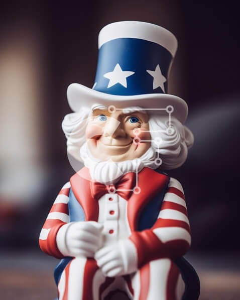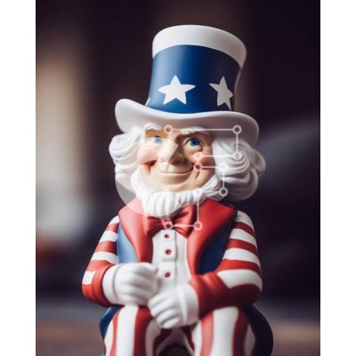 Υπάρχει δυνατότητα προσωποποίησης με δική σας φωτογραφία και προσαρμογής διαστάσεων κατόπιν παραγγελίας. Το συγεκεριμενο Puzzle 10x10 cm – 25 κομμ παρουσιαζει Η εικόνα παρουσιάζει ένα κεραμικό ειδώλιο του θείου Σαμ που φοράει πουκάμισο και γραβάτα με αμερικανική σημαία. Το ειδώλιο κάθεται στο έδαφος με τα χέρια σταυρωμένα μπροστά του, σαν να περιμένει κάποιον να έρθει. Μπορεί να προορίζεται να αντ