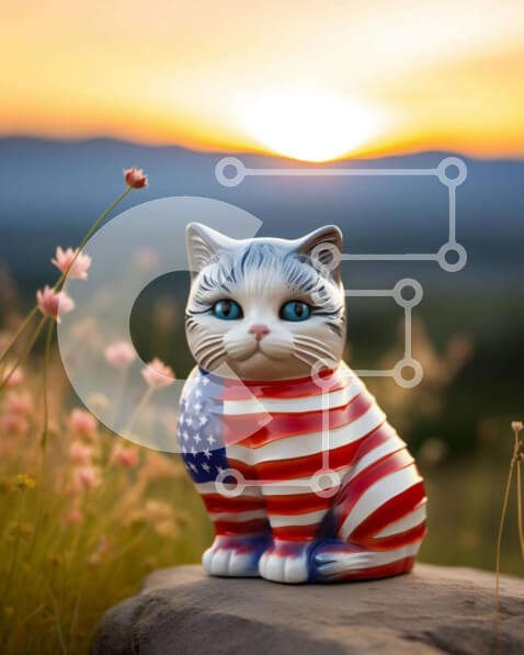 Υπάρχει δυνατότητα προσωποποίησης με δική σας φωτογραφία και προσαρμογής διαστάσεων κατόπιν παραγγελίας. Το συγεκεριμενο Puzzle 10x10 cm – 25 κομμ παρουσιαζει Η εικόνα παρουσιάζει ένα κεραμικό άγαλμα γάτας στολισμένο με σχέδιο αμερικανικής σημαίας, που στηρίζεται σε μια βραχώδη επιφάνεια. Το άγαλμα είναι διακοσμημένο με λευκές και κόκκινες ρίγες, που υποδηλώνουν έναν εορτασμό της ημέρας της ανεξαρ