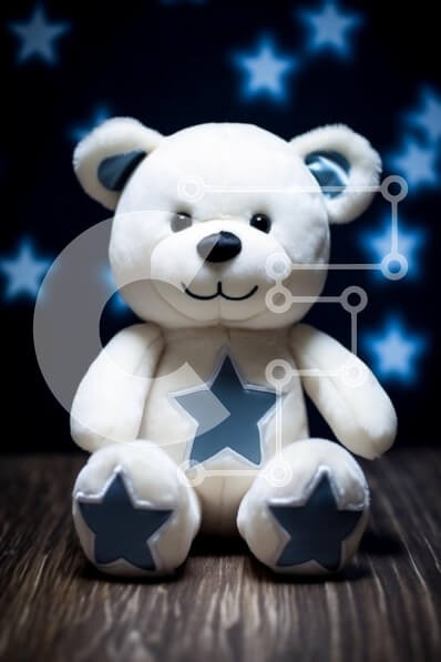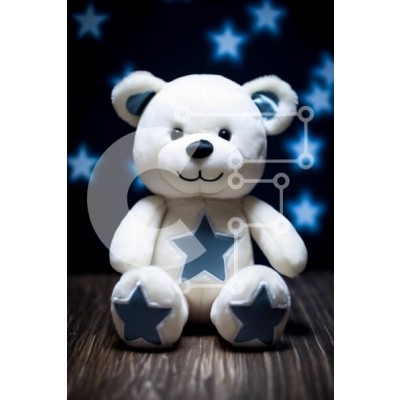 Υπάρχει δυνατότητα προσωποποίησης με δική σας φωτογραφία και προσαρμογής διαστάσεων κατόπιν παραγγελίας. Το συγεκεριμενο Puzzle 10x10 cm – 25 κομμ παρουσιαζει Αυτή η εικόνα παρουσιάζει ένα χαριτωμένο, βελούδινο αρκουδάκι με λευκό σώμα και μπλε τόνους. Έχει ένα χαμογελαστό πρόσωπο, με μαύρα μάτια και μύτη, και κάθεται σε σκούρο φόντο διακοσμημένο με σχέδια αστεριών. Η αρκούδα έχει γκρίζα αστέρια στ