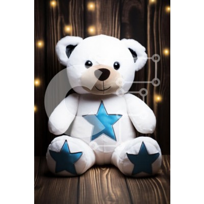 Υπάρχει δυνατότητα προσωποποίησης με δική σας φωτογραφία και προσαρμογής διαστάσεων κατόπιν παραγγελίας. Το συγεκεριμενο Puzzle 10x10 cm – 25 κομμ παρουσιαζει Αυτή η εικόνα παρουσιάζει ένα χαριτωμένο λευκό αρκουδάκι με μπλε αστέρια στην κοιλιά και τα πόδια του, να κάθεται σε ένα ξύλινο φόντο στολισμένο με απαλά λαμπερά φώτα. Το αρκουδάκι έχει μια φιλική έκφραση με μεγάλα στρογγυλά μάτια και στρογγ