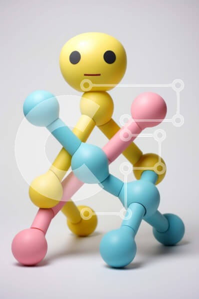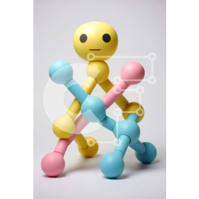 Υπάρχει δυνατότητα προσωποποίησης με δική σας φωτογραφία και προσαρμογής διαστάσεων κατόπιν παραγγελίας. Το συγεκεριμενο Puzzle 10x10 cm – 25 κομμ παρουσιαζει Αυτή η εικόνα παρουσιάζει ένα πολύχρωμο μοντέλο που αντιπροσωπεύει έναν παιχνιδιάρικο χαρακτήρα φτιαγμένο από αλληλοσυνδεόμενες σφαίρες και ράβδους σε μια ιδιότροπη στάση. Ο χαρακτήρας είναι κίτρινος με απλό πρόσωπο και αλληλεπιδρά με μπλε,