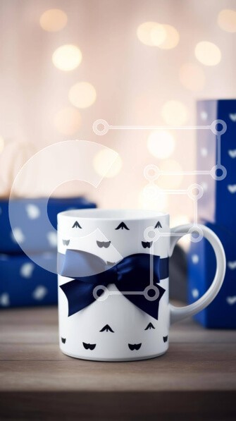 Υπάρχει δυνατότητα προσωποποίησης με δική σας φωτογραφία και προσαρμογής διαστάσεων κατόπιν παραγγελίας. Το συγεκεριμενο Puzzle 10x10 cm – 25 κομμ παρουσιαζει Αυτή η εικόνα παρουσιάζει μια κομψή κούπα καφέ διακοσμημένη με ασπρόμαυρα μουστάκια, που συμπληρώνεται από μια μπλε κορδέλα που συνδέεται στο χείλος. Γύρω από την κούπα υπάρχουν πολλά κουτιά δώρων, μερικά από τα οποία είναι τυλιγμένα σε γιορ