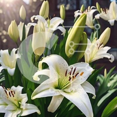 Υπάρχει δυνατότητα προσωποποίησης με δική σας φωτογραφία και προσαρμογής διαστάσεων κατόπιν παραγγελίας. Το συγεκεριμενο puzzle παρουσιαζει Η εικόνα παρουσιάζει μια ομάδα λευκών κρίνων σε πλήρη άνθηση, φωτισμένα από τον ήλιο. Αυτά τα λουλούδια χρησιμοποιούνται συνήθως για διακοσμητικούς σκοπούς, όπως η δημιουργία ανθοδέσμων ή κεντρικών κομματιών. Επιπλέον, είναι γνωστά για τα υψηλά επίπεδα βιταμίνης C και ασβεστίο