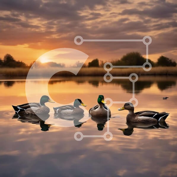 Υπάρχει δυνατότητα προσωποποίησης με δική σας φωτογραφία και προσαρμογής διαστάσεων κατόπιν παραγγελίας. Το συγεκεριμενο puzzle παρουσιαζει Η εικόνα παρουσιάζει τέσσερις πάπιες να κολυμπούν σε ένα υδάτινο σώμα το ηλιοβασίλεμα. Φαίνονται να ακουμπούν στην επιφάνεια του νερού, κάτι που υποδηλώνει ότι απολαμβάνουν τον χρόνο τους στον ήλιο. Είναι πιθανό ότι αυτά τα πουλιά αποτελούν μέρος ενός ενεργού κοπαδιού, καθώς φ